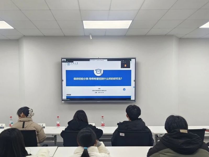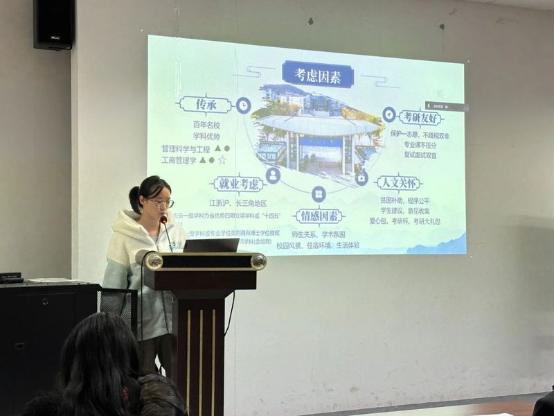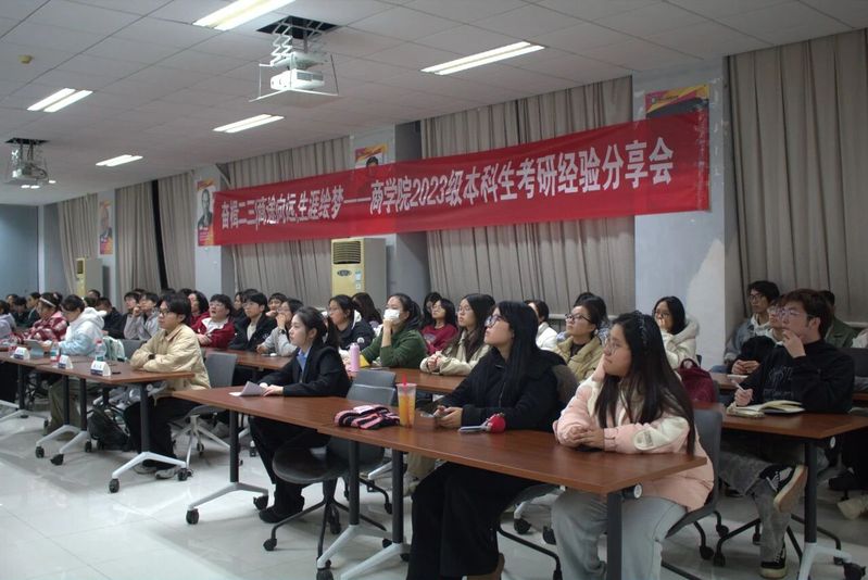 为进一步落实立德树人根本任务,发挥朋辈帮扶和引领作用,助力学生明晰未来生涯方向,科学规划升学深造,德赢官网2023级本科生分别于12月10日、12月18日在博学楼辅楼A103、A104开展“商途向远,生涯绘梦”升学经验分享会。两场经验分享会邀请到了李梅秀、林佳欣、邱菁秀、浩铭、于博雅、卢玥、雷舒7位2021、2022级考研、推免成功的同学和2021届毕业生叶勇同学进行分享。活动由2023级本科生辅导员周子芮老师主持。