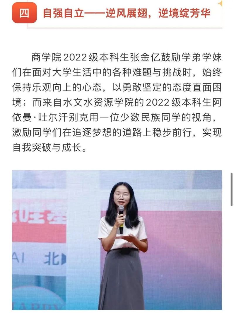 张金亿来自于农村困难家庭,她在国家、社会与学校的爱心与关怀下一路成长,是国家的资助育人政策助力她从义务教育阶段一路走到大学校园,感恩的种子早早在她心中播种。进入大学之后,她先后成为学校“青马工程”学员、“1442工程”学员、院学生会主席、年级团总支辅导员助理、学生工作处助管等,拥有校、院多级平台的“n”重身份,在丰富、扎实的学生工作中汲取养分,向上生长,并立志回馈。她不断了解多重资助政策,参与学校“以诚信感恩为翼,展青春励志之姿”征文比赛,真诚发表自己关于资助政策与成长之路的感想。同时,她也积极参与红色精神相关活动,加入团中央全国大学生遵义会议精神志愿宣讲团队、跟随学院红色水利团队开展调研,深入一线了解基层政策,不断沉淀自己的“红”色感恩心,也在心底深深扎下自己的“助梦根”。